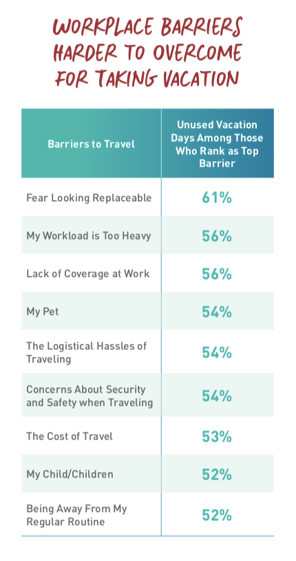 "Work-related challenges had the most influence on Americans’ ability to vacation. Employees who were concerned that they would appear less dedicated or even replaceable if they took a vacation were dramatically less likely to use all their vacation time (61% leave time unused,compared to 52% overall). Those who felt their workload was too heavy to get away were also more likely than average to have unused vacation time (57% to 52%), as were employees who felt there was a lack of coverage or that no one else could do their job (56% to 52%)."